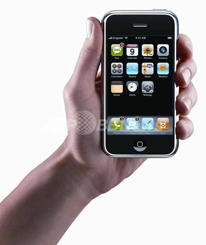 サンフランシスコ(San Francisco)で開催されたMacworldで9日、アップルCEOのスティーブ・ジョブズ(Steve Jobs)氏により披露されたiPhoneは、薄さわずか1.3センチ。携帯電話、インターネット、MP3プレーヤー機能のほか、200万画素のデジタルカメラも内蔵している。