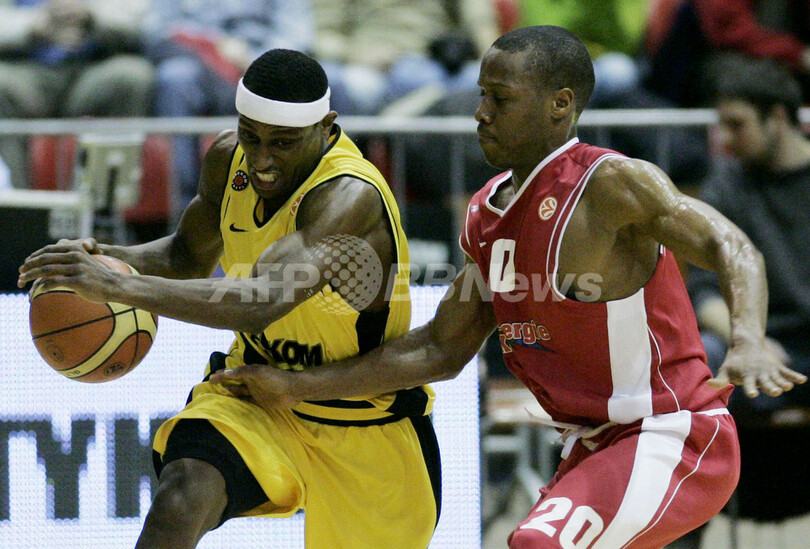 【グダニスク/ポーランド 18日 AFP】バスケットボール、ユーロリーグ・グループA、プロコム・トレフル・ソポト(Prokom Trefl Sopot)vsラインエネルギエ(Rheinenergie)。プロコムのアダム・ヴォイチク(Adam Wojcik)は、この試合両チーム最多となる22得点を記録してチームの勝利に貢献した。試合はプロコムが72-61で勝利し、グループリーグ5勝目を挙げた。写真は、ラインエネルギエのマーチン・ゴート(Marcin Gortat)に密着マークを受けるヴォイチク(右)。(c)AFP/Krzysztof Mystkowski