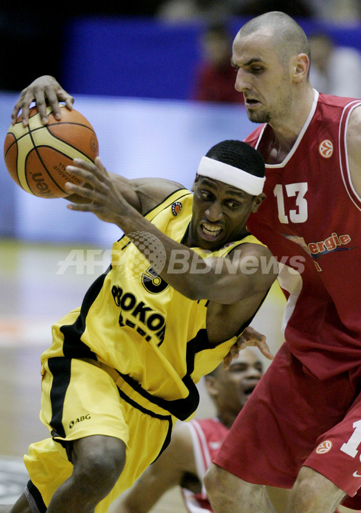 【グダニスク/ポーランド 18日 AFP】バスケットボール、ユーロリーグ・グループA、プロコム・トレフル・ソポト(Prokom Trefl Sopot)vsラインエネルギエ(Rheinenergie)。プロコムのアダム・ヴォイチク(Adam Wojcik)は、この試合両チーム最多となる22得点を記録してチームの勝利に貢献した。試合はプロコムが72-61で勝利し、グループリーグ5勝目を挙げた。写真は、ラインエネルギエのマーチン・ゴート(Marcin Gortat)に密着マークを受けるヴォイチク(右)。(c)AFP/Krzysztof Mystkowski