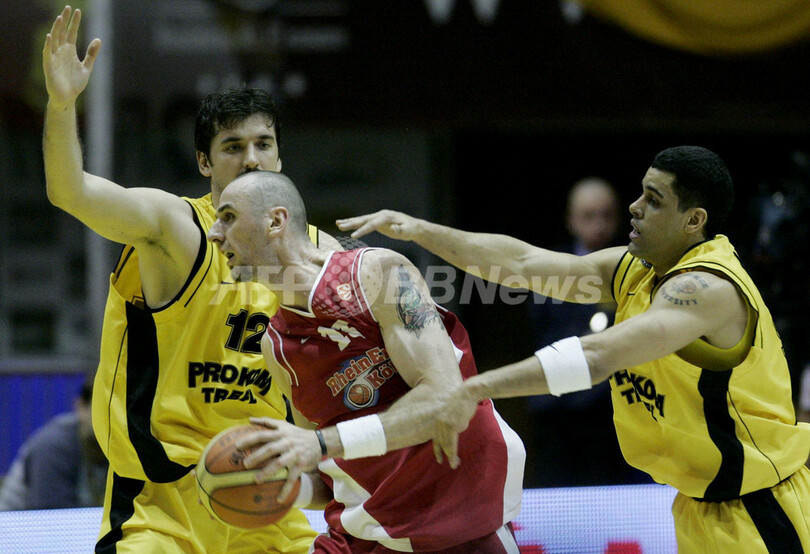 【グダニスク/ポーランド 18日 AFP】バスケットボール、ユーロリーグ・グループA、プロコム・トレフル・ソポト(Prokom Trefl Sopot)vsラインエネルギエ(Rheinenergie)。プロコムのアダム・ヴォイチク(Adam Wojcik)は、この試合両チーム最多となる22得点を記録してチームの勝利に貢献した。試合はプロコムが72-61で勝利し、グループリーグ5勝目を挙げた。写真は、ラインエネルギエのマーチン・ゴート(Marcin Gortat)に密着マークを受けるヴォイチク(右)。(c)AFP/Krzysztof Mystkowski