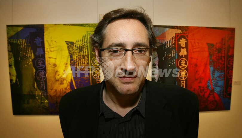 【上海/中国 20日 AFP】フランス人アーティスト、Jean Louis Simerayの作品展が16日から30日まで上海美術館(Shanghai Art Museum)で開催される。2週間に渡る同展示会ではSimerayの写真、油絵、グラフィック作品などが展示される。写真は19日、同美術館で自身の作品「China Portrait 1 and 2」を背景にポーズをとるJean Louis Simeray。(c)AFP/Mark RALSTON