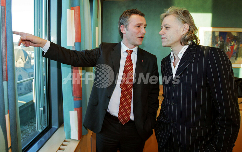 【オスロ/ノルウェー 20日 AFP】アイルランド出身のミュージシャン/慈善活動家、ボブ・ゲルドフ(Bob Geldof、右)が19日、イェンス・ストルテンベルグ(Jens Stoltenberg)首相と首相官邸で言葉を交わす。ゲルドフは1985年、多くのミュージシャンに呼びかけ、アフリカの難民救済コンサート「ライブ・エイド(LIVE AID)」を開催。又、2005年にも公平な貿易や貧困国の債務の帳消しを訴える大規模なコンサート、LIVE 8を世界中で開催している。ゲルドフはこの後、エーリク・ソールハイム(Erik Solheim)国際開発相と対談する予定。(c)AFP/LISE ASERUD