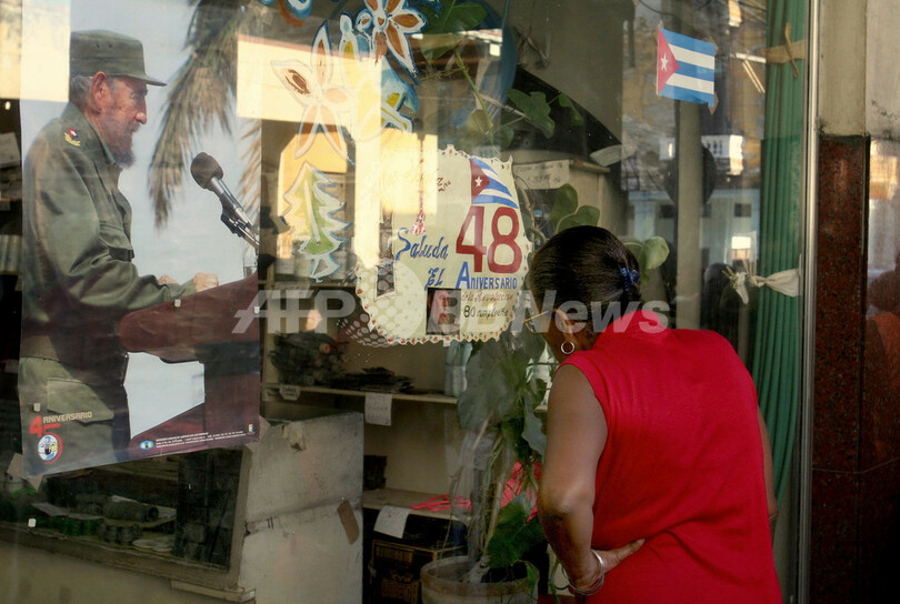 【ハバナ/キューバ 20日 AFP】2006年12月にフィデル・カストロ(Fidel Castro)議長(80)を診察したスペイン人医師は17日、議長が重症であるとするメディアの報道を否定し、病状は改善に向かっていると重ねて強調した。議長の容体は2006年7月27日の手術以降回復に向かっているとされてきたが、権限が弟のラウル・カストロ(Raul Castro)第1副議長に移譲され、公に姿を見せていなかったことから、職務に復帰することはないかもしれないとの憶測が広がっていた。写真はハバナ(Havana)で19日、カストロ議長の写真が貼られた店のウインドー越しに店内をのぞき込む女性。(c)AFP