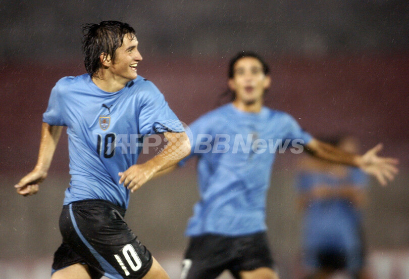 【アスンシオン/パラグアイ 19日 AFP】サッカー、南米ユース選手権(2007 South American Youth Championship)・決勝リーグ、パラグアイvsウルグアイ。ウルグアイのエディソン・カヴァーニ(Edison Cavani)は前半27分にチーム3点目となるゴールを決める。カヴァーニはこのゴールで大会通算5得点目を記録し、得点ランキング首位となった。試合はウルグアイが3-1でパラグアイに勝利し、決勝リーグ初戦を白星で飾った。写真は、チームメートと得点を喜ぶカヴァーニ。(c)AFP/Miguel ROJO