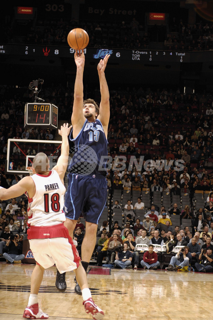 【トロント/カナダ 19日 AFP】06-07NBA、トロント・ラプターズ(Toronto Raptors)vsユタ・ジャズ(Utah Jazz)。ジャズのメメット・オコワー(Mehmet Okur)は、チーム最多の27得点を挙げる活躍を見せてチームの勝利に貢献。試合は中盤に奪ったリードを守り切ったジャズが102-94でラプターズを降し、今季6度目の連勝を果たした。写真は、ラプターズのアンソニー・パーカー(Anthony Parker)の目の前でジャンプシュートを放つオコワー。(c)AFP/Getty Images Ron Turenne