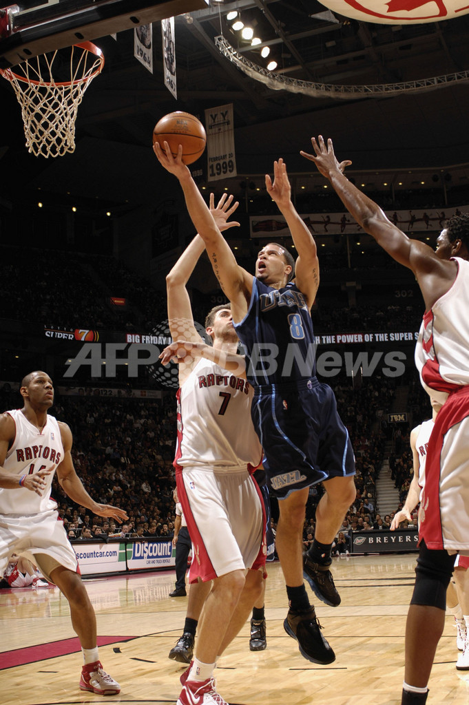 【トロント/カナダ 19日 AFP】06-07NBA、トロント・ラプターズ(Toronto Raptors)vsユタ・ジャズ(Utah Jazz)。ジャズのメメット・オコワー(Mehmet Okur)は、チーム最多の27得点を挙げる活躍を見せてチームの勝利に貢献。試合は中盤に奪ったリードを守り切ったジャズが102-94でラプターズを降し、今季6度目の連勝を果たした。写真は、ラプターズのアンソニー・パーカー(Anthony Parker)の目の前でジャンプシュートを放つオコワー。(c)AFP/Getty Images Ron Turenne