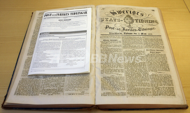 【ストックホルム/スウェーデン 20日 AFP】世界で最も古い歴史を持つ「ポスト・オック・インリッケス・ティドニンガー(Post Och Inrikes Tidningar、PoIT)」は、新聞の印刷を2006年末に終了し、2007年から全面的にインターネットでの情報提供に切り替えた。