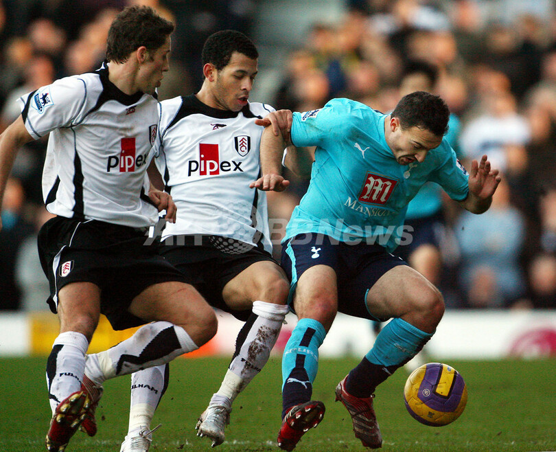 【ロンドン/英国 20日 AFP】サッカー、イングランド・プレミアリーグ・第24節、フラム(Fulham)vsトッテナム・ホットスパー(Tottenham Hotspur)。試合は1-1のドローに終わり、両チームは勝ち点1を分け合った。写真は、トッテナムのステード・マルブランク(Steed Malbranque、右)をマークするフラムのマイケル・ブラウン(Michael Brown、左)とリアム・ローズナイアー(Liam Rosenior、中央)。(c)AFP/ADRIAN DENNIS