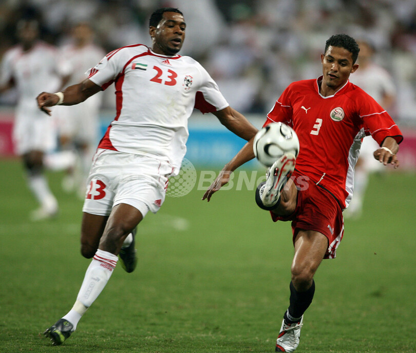 【アブダビ/UAE 20日 AFP】サッカー、ガルフカップ2007(Gulf Cup 2007)・グループA、UAEvsイエメン。UAEのバシル・サイード(Basheer Saeed、右)は、後半19分に決勝点となるチーム2点目のゴールを決めてナワフ・ムバラク(Nawaf Mubarak)から祝福を受ける。試合はUAEが2-1で勝利を収め、通算成績を1勝1敗とした。(c)AFP/KARIM SAHIB