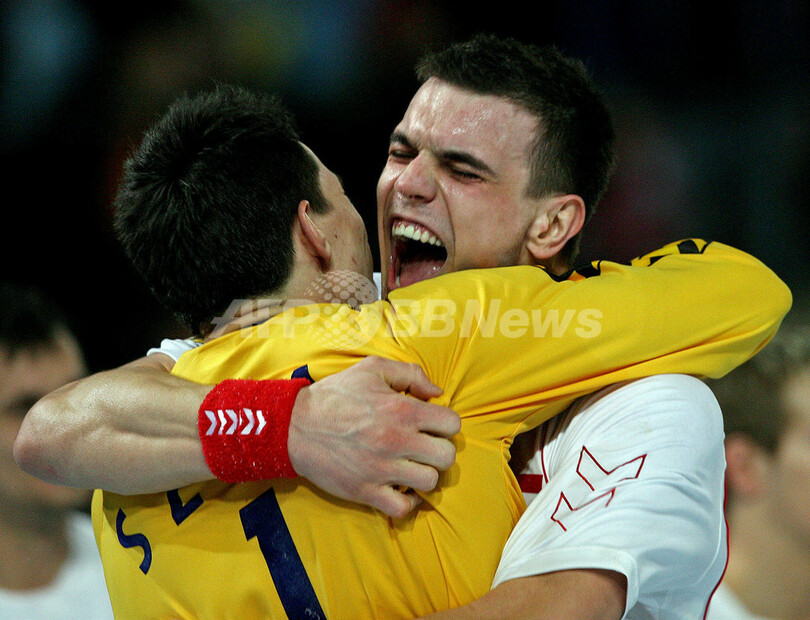 【ハレ/ドイツ 20日 AFP】ハンドボール、男子ハンドボール世界選手権2007(Men’s Handball World Championship)、予選ラウンド・グループC、ポーランドvsアルゼンチン。試合は、ポーランドが29-15でアルゼンチンに勝利、初戦を白星で飾った。写真は、ポーランドのGK、Slawomir Szmal(左)と歓喜して抱き合うMichal Jurecki。(c)AFP/RONNY HARTMANN