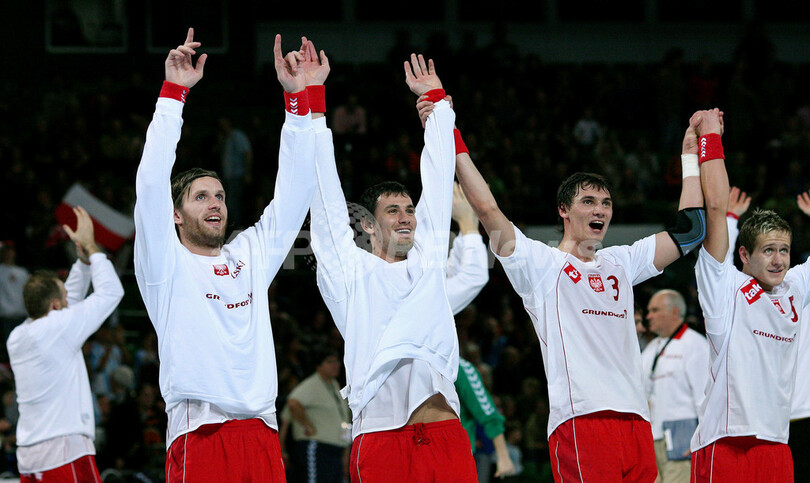 【ハレ/ドイツ 20日 AFP】ハンドボール、男子ハンドボール世界選手権2007(Men’s Handball World Championship)、予選ラウンド・グループC、ポーランドvsアルゼンチン。試合は、ポーランドが29-15でアルゼンチンに勝利、初戦を白星で飾った。写真は、ポーランドのGK、Slawomir Szmal(左)と歓喜して抱き合うMichal Jurecki。(c)AFP/RONNY HARTMANN