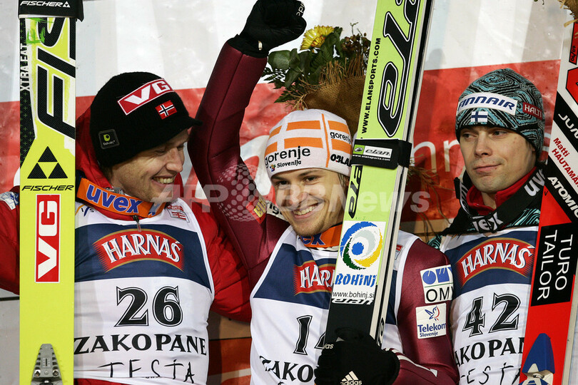 【ザコパネ/ポーランド 20日 AFP】ノルディックスキー・ジャンプW杯(FIS WORLD SKI JUMPING 2006/07)・第15戦・ラージヒル。大会は天候不良のため2本目は中止となり1本目の結果のみで順位が決められ、スロバキアのローク・ウルバンツ(Rok Urbanc)が136.0メートルを記録し、143.3ポイントでW杯初優勝を飾った。また2位には138.8ポイントを獲得したノルウェーのロアル・ヨケルソイ(Roar Ljoekelsoey、左)が、3位には134.7ポイントを獲得したフィンランドのマッティ・ハウタマキ(Matti Hautamaeki、右)がそれぞれ入った。(c)AFP/JANEK SKARZYNSKI