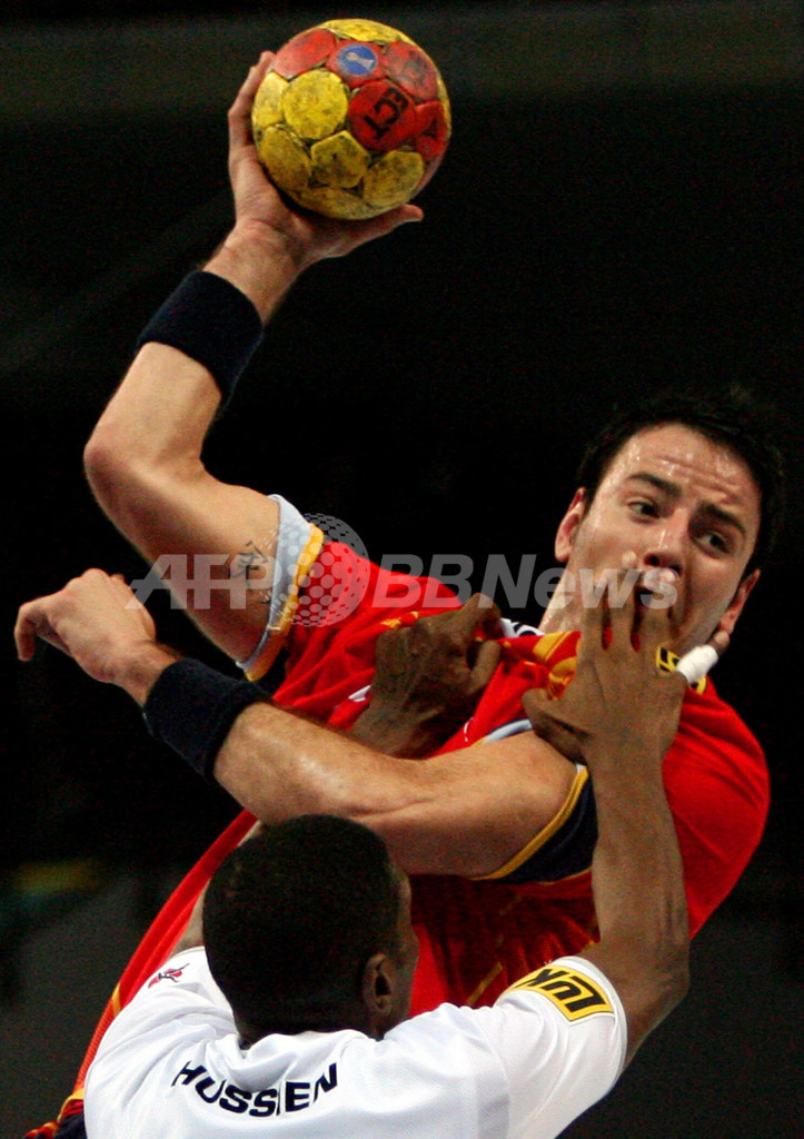 【ブレーメン/ドイツ 20日 AFP】ハンドボール、男子ハンドボール世界選手権2007(Men’s Handball World Championship)、予選ラウンド・グループD、スペインvsエジプト。スペインのイケル・ロメロ(Iker Romero)は、10本のシュートを放ち3得点を挙げる。試合はスペインが33-29でエジプトを降し初戦を勝利で飾った。写真は、エジプトのSaber Hussein越しにシュートを試みるスペインのロメロ(右)。(c)AFP/DDP DAVID HECKER