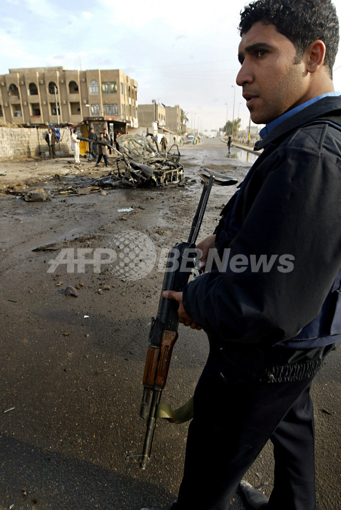 【バグダッド/イラク 21日 AFP】米軍は21日、首都バグダッド(Baghdad)の安定化支援のためとして、新たに3200人の兵士が同市に到着したと発表した。一方、米政府による新イラク戦略の一環として首都に数千人の米軍およびイラク軍兵士が投入される治安作戦の開始を前に、反政府勢力は首都での攻撃を教戒している。首都バグダッド中心部では21日、自動車爆弾が爆発し、1人が死亡、5人が負傷した。写真は21日、自動車爆弾によるテロ現場を警戒するイラクの警察官。(c)AFP/ALI YUSSEF