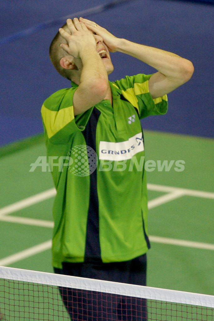 【クアラルンプール/マレーシア 21日 AFP】バドミントン、スーパーシリーズ(Super Series)第1戦、マレーシアオープン2007(Malaysia Open 2007)・男子シングルス・決勝。デンマークのピーター・ゲード(Peter Gade)は、中国のバオ・チュンライ(Bao Chunlai)と対戦。ゲードはセットカウント2-1(21-15、17-21、21-14)で勝利を収め、優勝を飾った。(c)AFP/TENGKU BAHAR