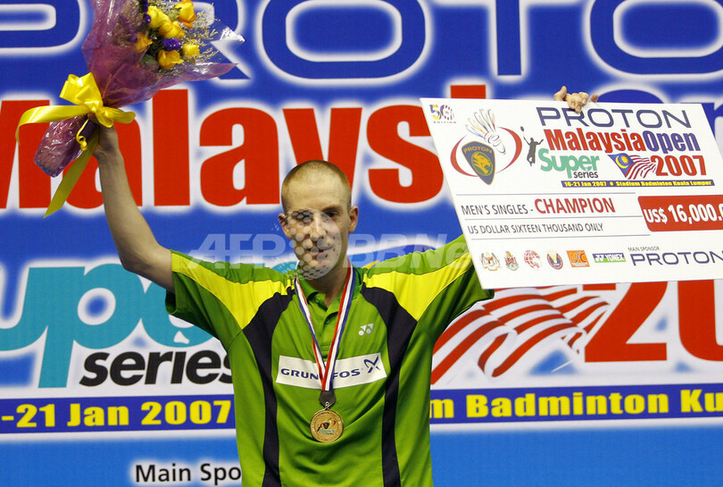 【クアラルンプール/マレーシア 21日 AFP】バドミントン、スーパーシリーズ(Super Series)第1戦、マレーシアオープン2007(Malaysia Open 2007)・男子シングルス・決勝。デンマークのピーター・ゲード(Peter Gade)は、中国のバオ・チュンライ(Bao Chunlai)と対戦。ゲードはセットカウント2-1(21-15、17-21、21-14)で勝利を収め、優勝を飾った。(c)AFP/TENGKU BAHAR