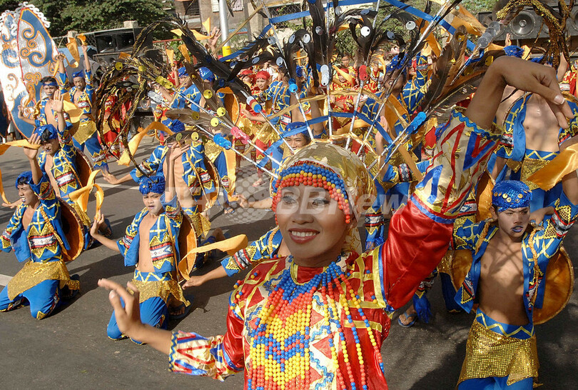 【セブ/フィリピン 21日 AFP】幼年時代のキリスト像サントニーニョ(Santo Nino)を祝うセブ(Cebu)島最大の9日間の祭「シヌログ(Sinulog)」が21日、クライマックスを迎え、1万人以上の舞踊家、音楽家らが路上に繰り出した。同島には、スペインのマゼランが1521年にセブ女王にもたらしたサントニーニョ像を保管するサントニーニョ教会があり、2007年はこの教会の建立441周年にあたる。写真は21日、セブ市の街路で踊る舞踊家たち。(c)AFP/Jay DIRECTO