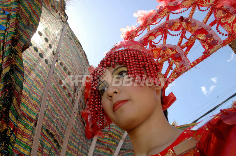 【セブ/フィリピン 21日 AFP】幼年時代のキリスト像サントニーニョ(Santo Nino)を祝うセブ(Cebu)島最大の9日間の祭「シヌログ(Sinulog)」が21日、クライマックスを迎え、1万人以上の舞踊家、音楽家らが路上に繰り出した。同島には、スペインのマゼランが1521年にセブ女王にもたらしたサントニーニョ像を保管するサントニーニョ教会があり、2007年はこの教会の建立441周年にあたる。写真は21日、セブ市の街路で踊る舞踊家たち。(c)AFP/Jay DIRECTO