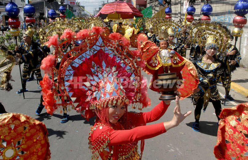 【セブ/フィリピン 21日 AFP】幼年時代のキリスト像サントニーニョ(Santo Nino)を祝うセブ(Cebu)島最大の9日間の祭「シヌログ(Sinulog)」が21日、クライマックスを迎え、1万人以上の舞踊家、音楽家らが路上に繰り出した。同島には、スペインのマゼランが1521年にセブ女王にもたらしたサントニーニョ像を保管するサントニーニョ教会があり、2007年はこの教会の建立441周年にあたる。写真は21日、セブ市の街路で踊る舞踊家たち。(c)AFP/Jay DIRECTO