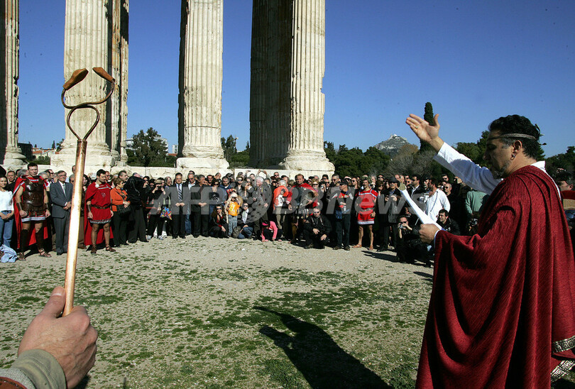 ニュース ライフ ギリシャ神を称える儀式が行われる - ギリシャ 2007年1月21日 20:44 発信地:ギリシャ [ ヨーロッパ ギリシャ ] このニュースをシェア ‹ › ❮ 3/4 ❯ 写真は、儀式の様子。(C)AFP Images Louisa Gouliamaki 画像作成中 ! 【アテネ/ギリシャ 21日 AFP】オリンパスの神々の一つ、ゼウスを称えた儀式が21日、アテネのゼウスの寺(Temple of Olympian Zeus)で行われた。これは、昨年一つの古代ギリシャ者宗教として認定された団体が主催する90分間の小さな儀式で、賛美歌の斉唱や、伝統的な踊りなどが行われた。写真は、儀式に参加した女性祭司。(C)AFP Images Louisa Gouliamaki ライフ 一覧へ> メディア・報道関係・法人の方向け 写真・動画 購入のお問合せ>