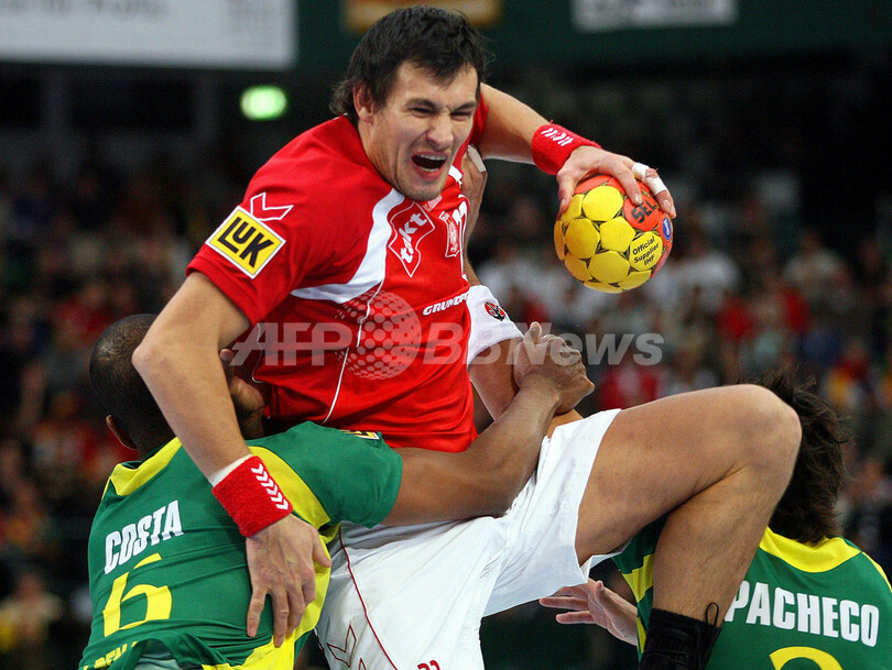 【ハレ/ドイツ 21日 AFP】ハンドボール、男子ハンドボール世界選手権2007(Men’s Handball World Championship)、予選ラウンド・グループC、ブラジルvsポーランド。試合はポーランドが31-23でブラジルを降し、開幕2連勝を飾った。写真は、ブラジルのディフェンスに苦しむポーランドのMarcin Lijewski。(c)AFP/PATRIK STOLLARZ