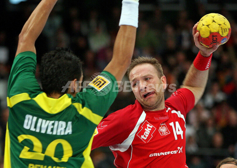【ハレ/ドイツ 21日 AFP】ハンドボール、男子ハンドボール世界選手権2007(Men’s Handball World Championship)、予選ラウンド・グループC、ブラジルvsポーランド。試合はポーランドが31-23でブラジルを降し、開幕2連勝を飾った。写真は、ブラジルのディフェンスに苦しむポーランドのMarcin Lijewski。(c)AFP/PATRIK STOLLARZ