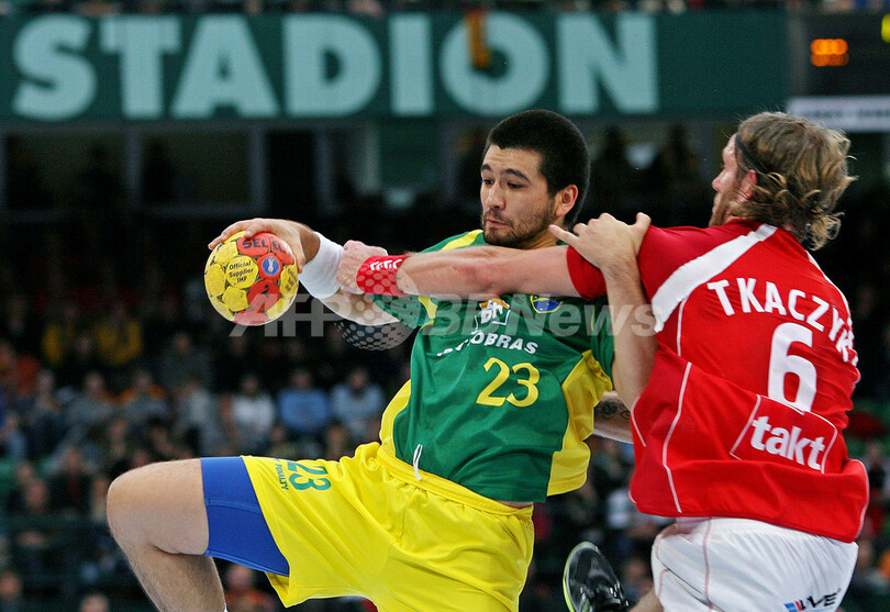 【ハレ/ドイツ 21日 AFP】ハンドボール、男子ハンドボール世界選手権2007(Men’s Handball World Championship)、予選ラウンド・グループC、ブラジルvsポーランド。試合はポーランドが31-23でブラジルを降し、開幕2連勝を飾った。写真は、ブラジルのディフェンスに苦しむポーランドのMarcin Lijewski。(c)AFP/PATRIK STOLLARZ