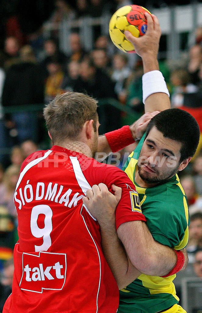 【ハレ/ドイツ 21日 AFP】ハンドボール、男子ハンドボール世界選手権2007(Men’s Handball World Championship)、予選ラウンド・グループC、ブラジルvsポーランド。試合はポーランドが31-23でブラジルを降し、開幕2連勝を飾った。写真は、ブラジルのディフェンスに苦しむポーランドのMarcin Lijewski。(c)AFP/PATRIK STOLLARZ