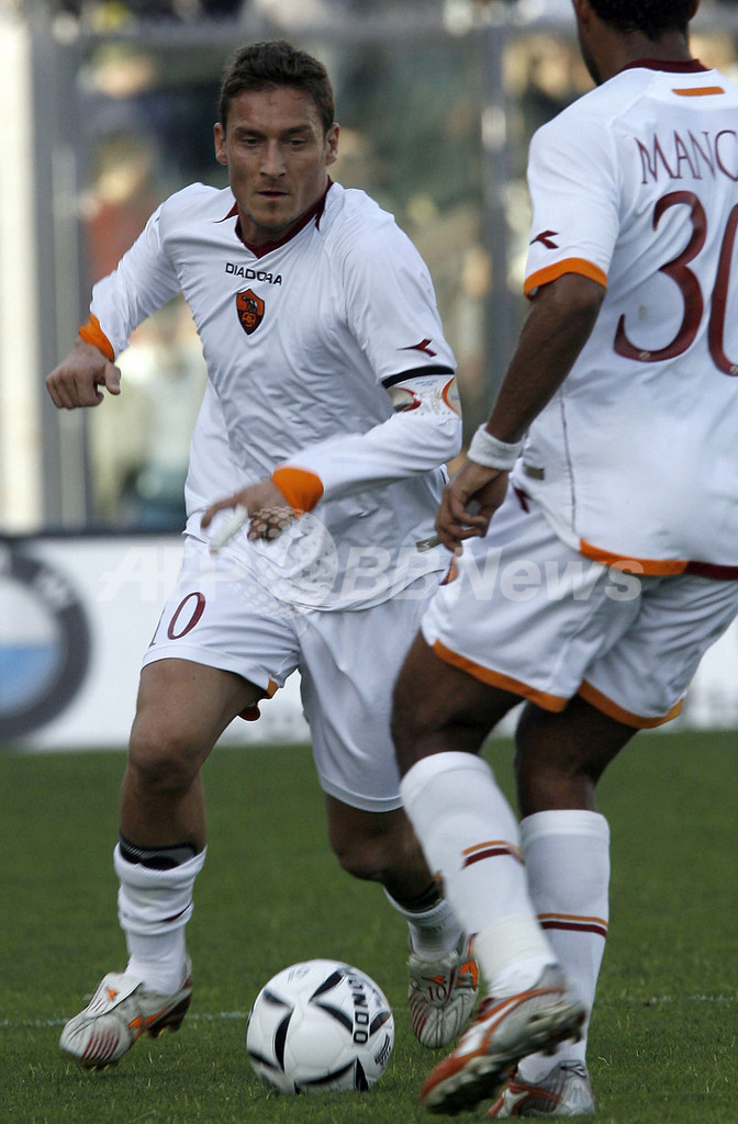 【リボルノ/イタリア 21日 AFP】サッカー、イタリア・セリエA・20節、リボルノ(Livorno)vsローマ(AS Roma)。ローマのフランチェスコ・トッティ(Francesco Totti)は、1点リードされて迎えた後半29分に同点ゴールを挙げシーズン13ゴール目をマークする。試合はこのまま1-1の引き分けに終わり、2試合連続でドローの結果に終わった2位ローマと首位インテル(Inter Milan)との勝ち点差は11に開いた。写真は、リボルノのファビオ・ガランテ(Fabio Galante、右)のファウルに抗議するトッティ。(c)AFP/NICO CASAMASSIMA