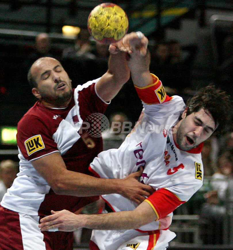 【ブレーメン/ドイツ 21日 AFP】ハンドボール、男子ハンドボール世界選手権2007(Men’s Handball World Championship)、予選ラウンド・グループD、カタールvsスペイン。試合はスペインが41-18で快勝し、開幕2連勝を飾った。写真は、カタールのRashid Al Remaihi(左)にシュートをブロックされるスペインのRaul Entrerrios。(c)AFP/DAVID HECKER