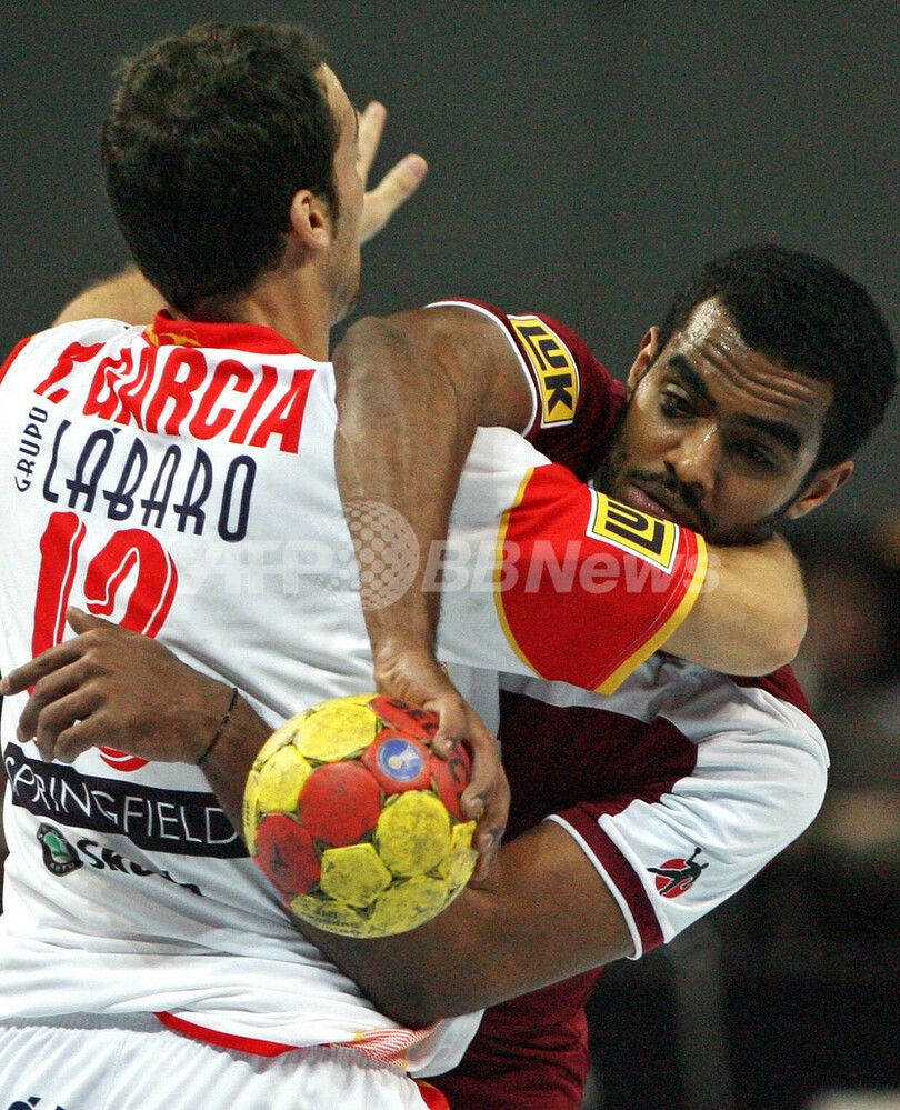 【ブレーメン/ドイツ 21日 AFP】ハンドボール、男子ハンドボール世界選手権2007(Men’s Handball World Championship)、予選ラウンド・グループD、カタールvsスペイン。試合はスペインが41-18で快勝し、開幕2連勝を飾った。写真は、カタールのRashid Al Remaihi(左)にシュートをブロックされるスペインのRaul Entrerrios。(c)AFP/DAVID HECKER
