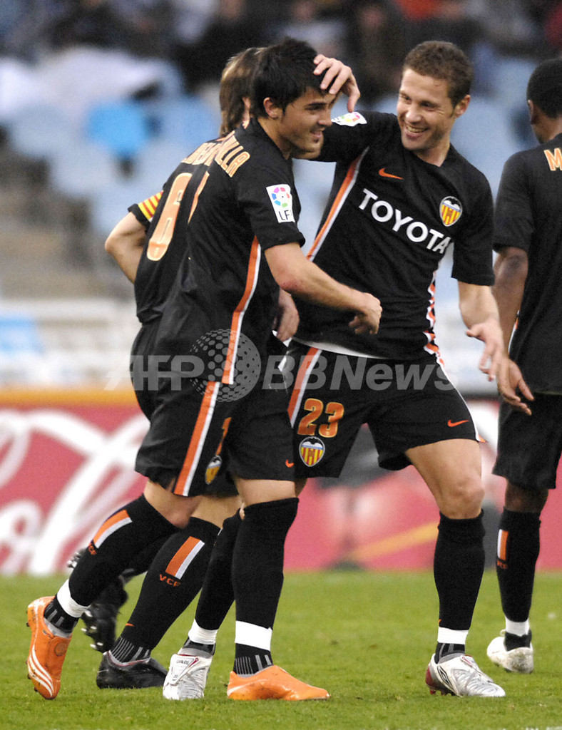 【サン・セバスチャン/スペイン 21日 AFP】サッカー、スペイン・リーガエスパニョーラ1部・第19節、レアル・ソシエダ(Real Sociedad)vsバレンシア(Valencia)。試合は前半28分のダビド・ビジャ(David Villa)のゴールを守りきったバレンシアが1-0で勝利を収め、6連勝を飾りシーズン10勝目を挙げた。写真は、クーロ・トーレス(Curro Torres、右)から祝福を受けるビジャ。(c)AFP/A. ARRIZURIETA