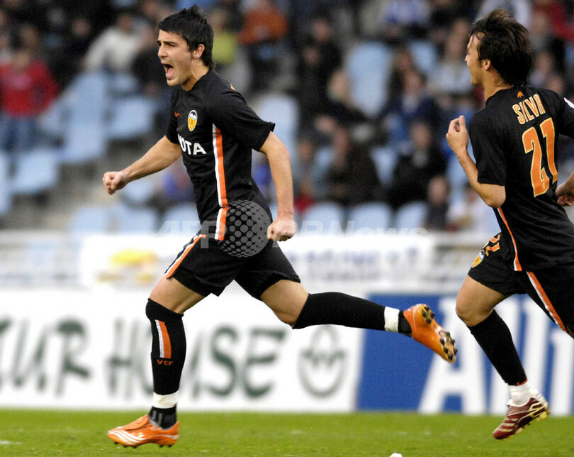 【サン・セバスチャン/スペイン 21日 AFP】サッカー、スペイン・リーガエスパニョーラ1部・第19節、レアル・ソシエダ(Real Sociedad)vsバレンシア(Valencia)。試合は前半28分のダビド・ビジャ(David Villa)のゴールを守りきったバレンシアが1-0で勝利を収め、6連勝を飾りシーズン10勝目を挙げた。写真は、クーロ・トーレス(Curro Torres、右)から祝福を受けるビジャ。(c)AFP/A. ARRIZURIETA