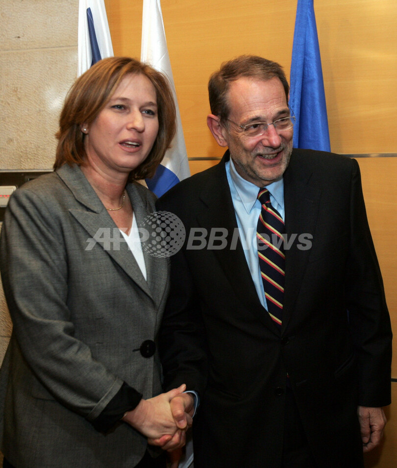 【エルサレム/イスラエル 22日 AFP】欧州連合(EU)のハビエル・ソラナ(Javier Solana)共通外交・安全保障上級代表は21日、エルサレム(Jerusalem)でエフド・オルメルト(Ehud Olmert)首相と会談した。イスラエル訪問に先立ちヨルダンを訪れたソラナ代表はアンマン(Amman)での記者会見で、イスラエルとパレスチナ自治区の問題について、最近会談した両国の関係者らの間には和平交渉再開のための「政治的意志」があったと語った。写真は同日、オルメルト首相と会談するEUのソラナ代表。(c)AFP/MOSHE MILLNER
