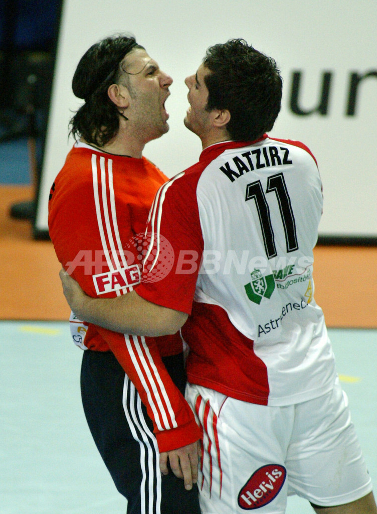【キール/ドイツ 21日 AFP】ハンドボール、男子ハンドボール世界選手権2007(Men’s Handball World Championship)、予選ラウンド・グループE、ハンガリーvsノルウェー。試合はハンガリーが25-22でノルウェーを降し、開幕2連勝を飾った。写真は、チームメートのDavid Katzirz(右)と勝利を喜ぶハンガリーのGKNenad Puljezevic。(c)AFP/ATTILA KISBENEDEK