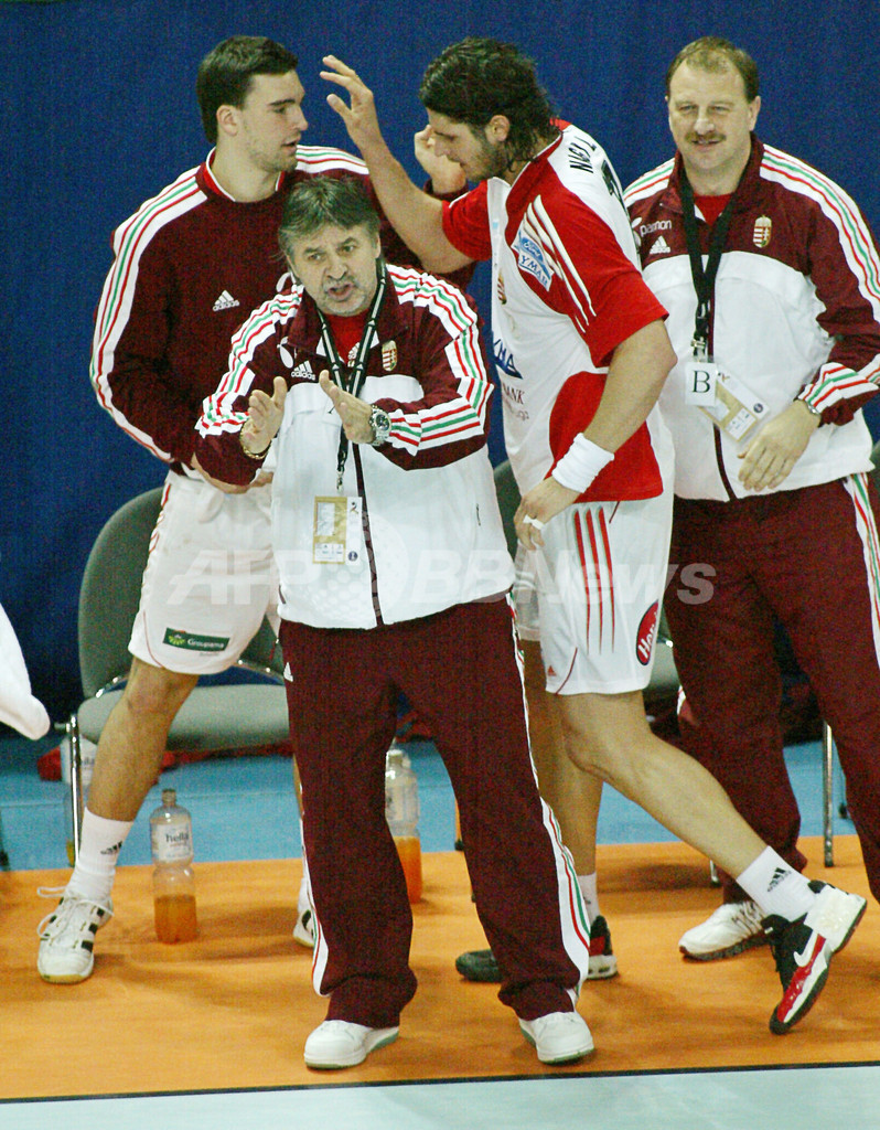 【キール/ドイツ 21日 AFP】ハンドボール、男子ハンドボール世界選手権2007(Men’s Handball World Championship)、予選ラウンド・グループE、ハンガリーvsノルウェー。試合はハンガリーが25-22でノルウェーを降し、開幕2連勝を飾った。写真は、チームメートのDavid Katzirz(右)と勝利を喜ぶハンガリーのGKNenad Puljezevic。(c)AFP/ATTILA KISBENEDEK