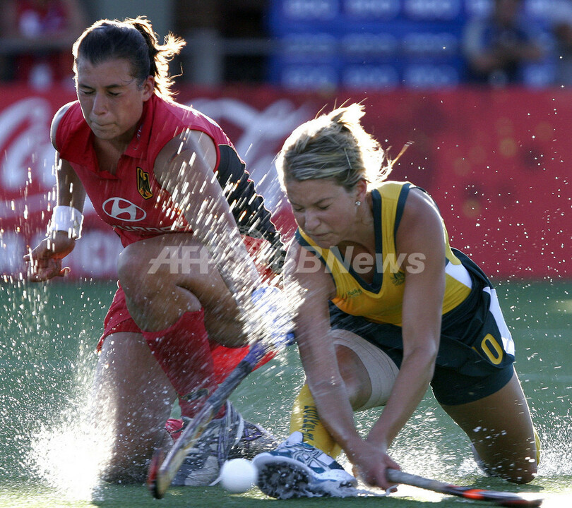 【ブエノスアイレス/アルゼンチン 21日 AFP】女子ホッケー、第15回チャンピオンズ・トロフィー(BDO Hockey Champions Trophy Women 2007)・3位決定戦、オーストラリアvsドイツ。試合はオーストラリアが0-2で敗れ4位で大会を終えた。写真は、ドイツのJulia Muellerとボールを競るオーストラリアのAmy Korner(右)。(c)AFP/STR