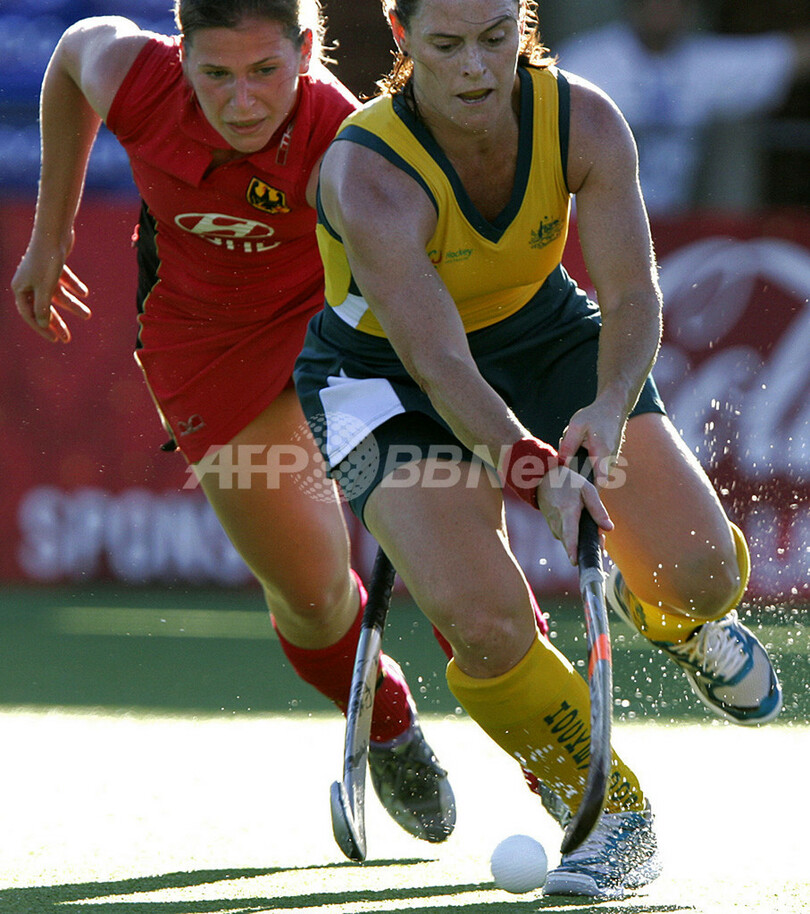 【ブエノスアイレス/アルゼンチン 21日 AFP】女子ホッケー、第15回チャンピオンズ・トロフィー(BDO Hockey Champions Trophy Women 2007)・3位決定戦、オーストラリアvsドイツ。試合はオーストラリアが0-2で敗れ4位で大会を終えた。写真は、ドイツのJulia Muellerとボールを競るオーストラリアのAmy Korner(右)。(c)AFP/STR