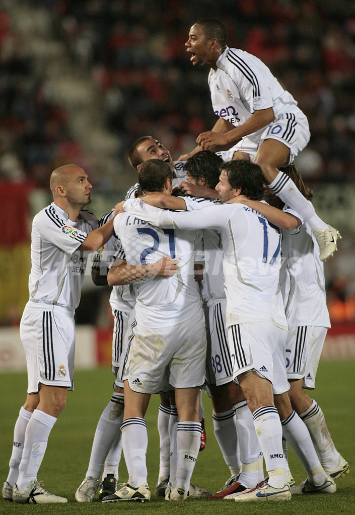 【マドリード/スペイン 21日 AFP】サッカー、スペイン・リーガエスパニョーラ1部・第19節、マジョルカ(Mallorca)vsレアル・マドリード(Real Madrid)。試合はアウェーのレアル・マドリードが後半33分にホセ・アントニオ・レイェス(Jose Antonio Reyes)のゴールで先制し、1-0でマジョルカを降しリーグ2連勝で勝ち点を38に伸ばした。写真は、ゴールを喜ぶレアル・マドリードの選手たち。(c)AFP/Jaime REINA