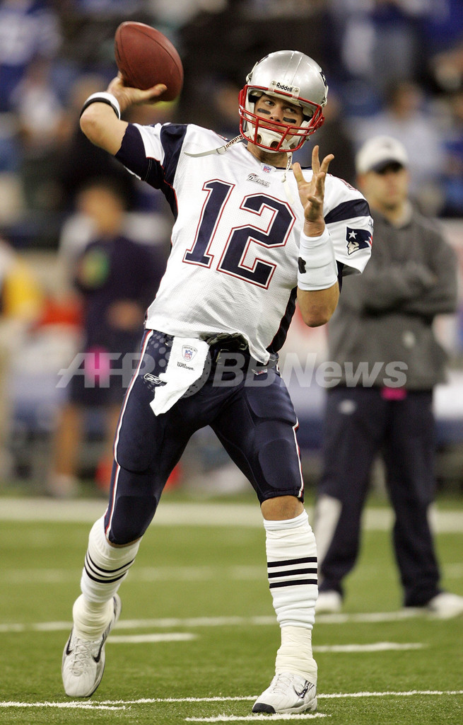 【インディアナポリス/米国 21日 AFP】NFL・プレーオフAFC決勝、インディアナポリス・コルツ(Indianapolis Colts)vsニューイングランド・ペイトリオッツ(New England Patriots)。ペイトリオッツのQBトム・ブレイディ(Tom Brady)は、1インターセプトを喫するも、1タッチダウンを含む34回中21本のパスを成功させ232ヤードを獲得した。しかし試合は、ペイトリオッツが第4Q残り1分でコルツに逆転を喫し34-38で敗れ、スーパーボウル進出を逃した。(c)AFP/Getty Images Andy Lyons