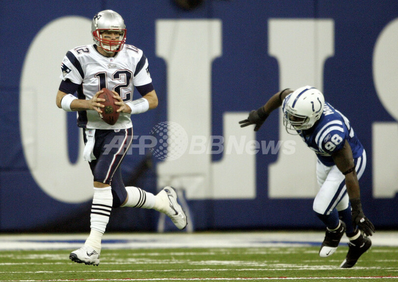【インディアナポリス/米国 21日 AFP】NFL・プレーオフAFC決勝、インディアナポリス・コルツ(Indianapolis Colts)vsニューイングランド・ペイトリオッツ(New England Patriots)。ペイトリオッツのQBトム・ブレイディ(Tom Brady)は、1インターセプトを喫するも、1タッチダウンを含む34回中21本のパスを成功させ232ヤードを獲得した。しかし試合は、ペイトリオッツが第4Q残り1分でコルツに逆転を喫し34-38で敗れ、スーパーボウル進出を逃した。(c)AFP/Getty Images Andy Lyons
