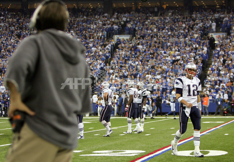 【インディアナポリス/米国 21日 AFP】NFL・プレーオフAFC決勝、インディアナポリス・コルツ(Indianapolis Colts)vsニューイングランド・ペイトリオッツ(New England Patriots)。ペイトリオッツのQBトム・ブレイディ(Tom Brady)は、1インターセプトを喫するも、1タッチダウンを含む34回中21本のパスを成功させ232ヤードを獲得した。しかし試合は、ペイトリオッツが第4Q残り1分でコルツに逆転を喫し34-38で敗れ、スーパーボウル進出を逃した。(c)AFP/Getty Images Andy Lyons