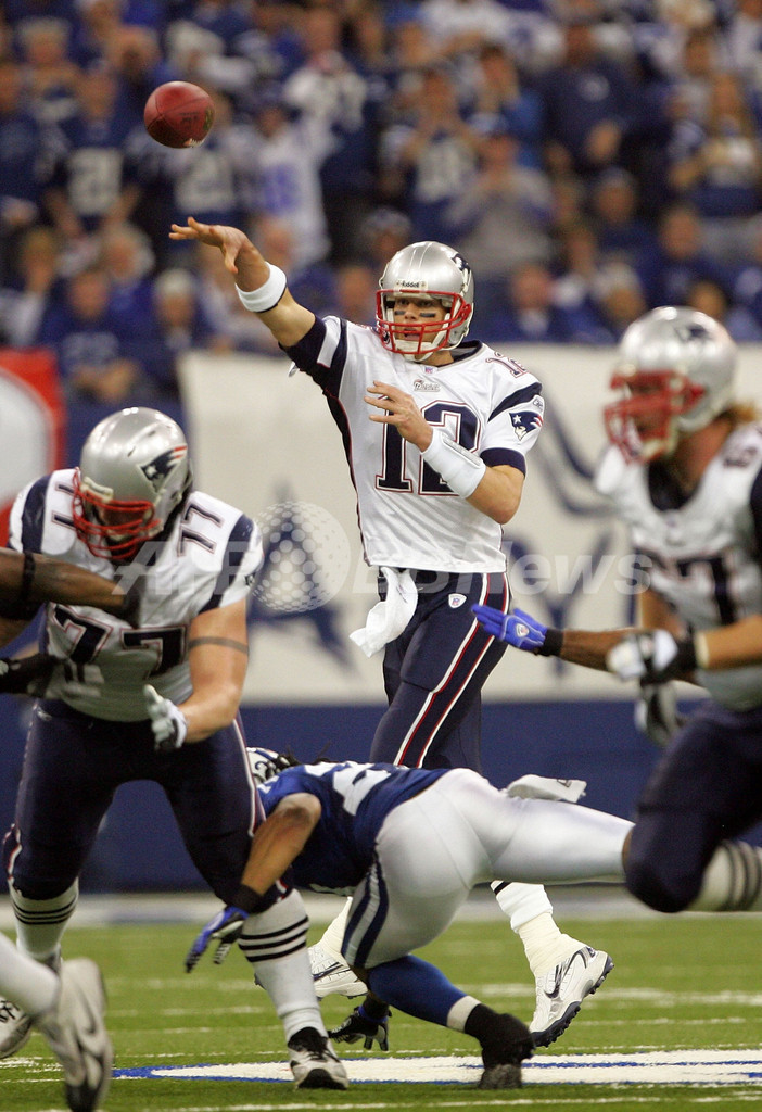 【インディアナポリス/米国 21日 AFP】NFL・プレーオフAFC決勝、インディアナポリス・コルツ(Indianapolis Colts)vsニューイングランド・ペイトリオッツ(New England Patriots)。ペイトリオッツのQBトム・ブレイディ(Tom Brady)は、1インターセプトを喫するも、1タッチダウンを含む34回中21本のパスを成功させ232ヤードを獲得した。しかし試合は、ペイトリオッツが第4Q残り1分でコルツに逆転を喫し34-38で敗れ、スーパーボウル進出を逃した。(c)AFP/Getty Images Andy Lyons