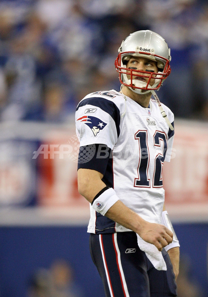 【インディアナポリス/米国 21日 AFP】NFL・プレーオフAFC決勝、インディアナポリス・コルツ(Indianapolis Colts)vsニューイングランド・ペイトリオッツ(New England Patriots)。ペイトリオッツのQBトム・ブレイディ(Tom Brady)は、1インターセプトを喫するも、1タッチダウンを含む34回中21本のパスを成功させ232ヤードを獲得した。しかし試合は、ペイトリオッツが第4Q残り1分でコルツに逆転を喫し34-38で敗れ、スーパーボウル進出を逃した。(c)AFP/Getty Images Andy Lyons