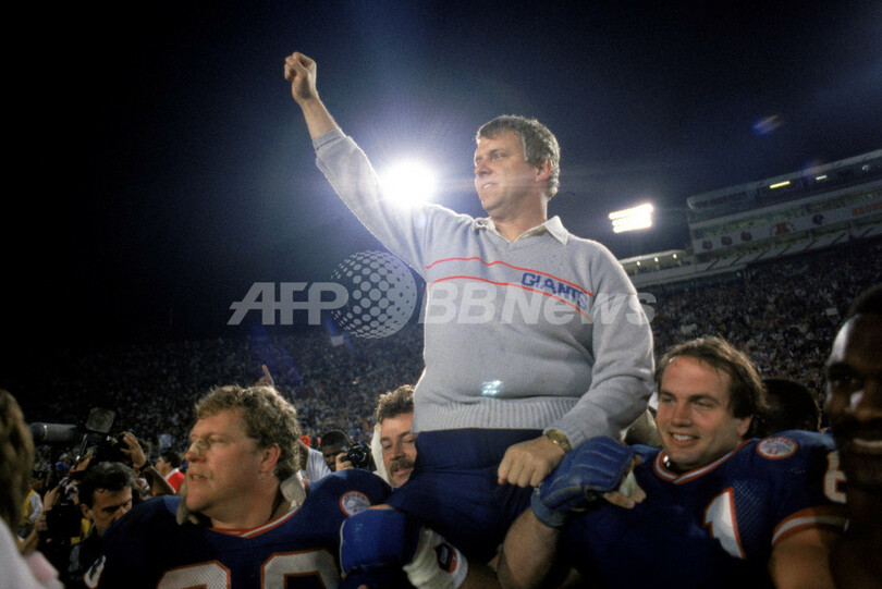 写真は、デンバー・ブロンコス(Denver Broncos)との第21回スーパーボウルを制し祝福を受けるパーセルズ氏(1987年1月25日撮影)。(c)AFP/Getty Images Mike Powell