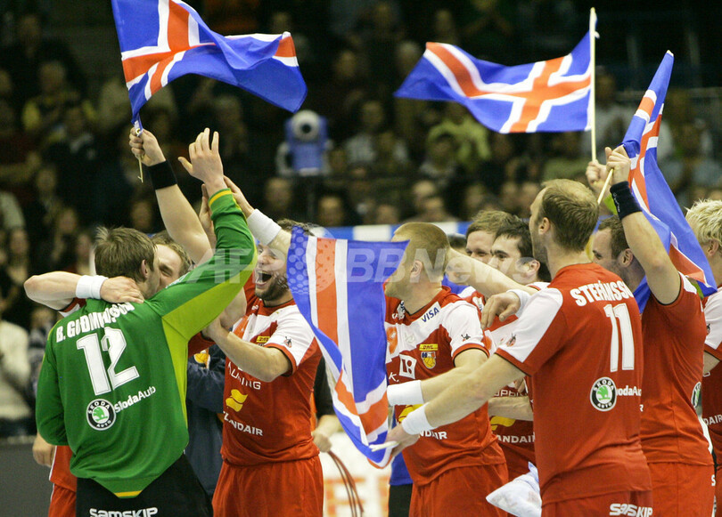 【マグデブルク/ドイツ 22日 AFP】ハンドボール、男子ハンドボール世界選手権2007(Men’s Handball World Championship)、予選ラウンド・グループB、フランスvsアイスランド。試合はアイスランドが32-24で勝利を収めた。アイスランドは通算成績2勝1敗でフランスとウクライナに並ぶがグループ1位での決勝ラウンド進出を決めた。写真は、勝利に歓喜するアイスランドの選手たち。(c)AFP/JACQUES DEMARTHON
