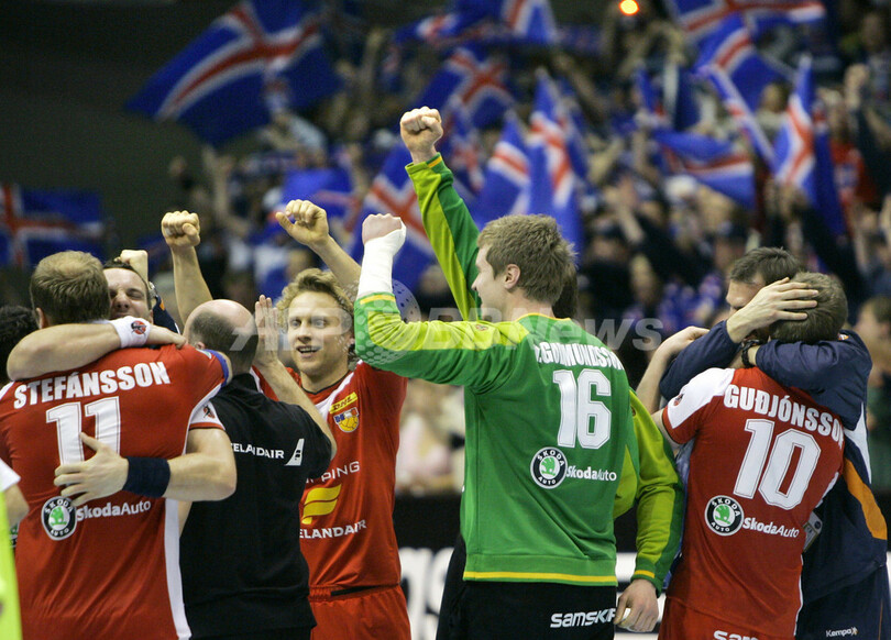 【マグデブルク/ドイツ 22日 AFP】ハンドボール、男子ハンドボール世界選手権2007(Men’s Handball World Championship)、予選ラウンド・グループB、フランスvsアイスランド。試合はアイスランドが32-24で勝利を収めた。アイスランドは通算成績2勝1敗でフランスとウクライナに並ぶがグループ1位での決勝ラウンド進出を決めた。写真は、勝利に歓喜するアイスランドの選手たち。(c)AFP/JACQUES DEMARTHON