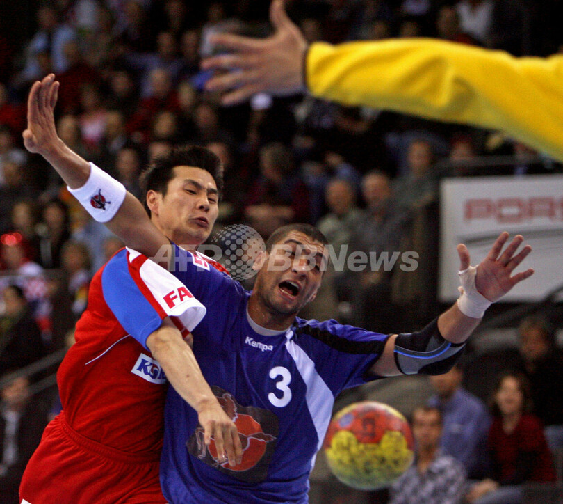 【シュツットガルト/ドイツ 22日 AFP】ハンドボール、男子ハンドボール世界選手権2007(Men’s Handball World Championship)、予選ラウンド・グループF、モロッコvs韓国。試合はモロッコが19-32で韓国に敗れ3連敗を喫し、モロッコはグループ最下位で予選ラウンドを終えた。写真は、韓国のLee Jae-WooのシュートをブロックするモロッコのMohamed Berrajaa(左)とKhaled Imaghri。(c)AFP/JOHN MACDOUGALL