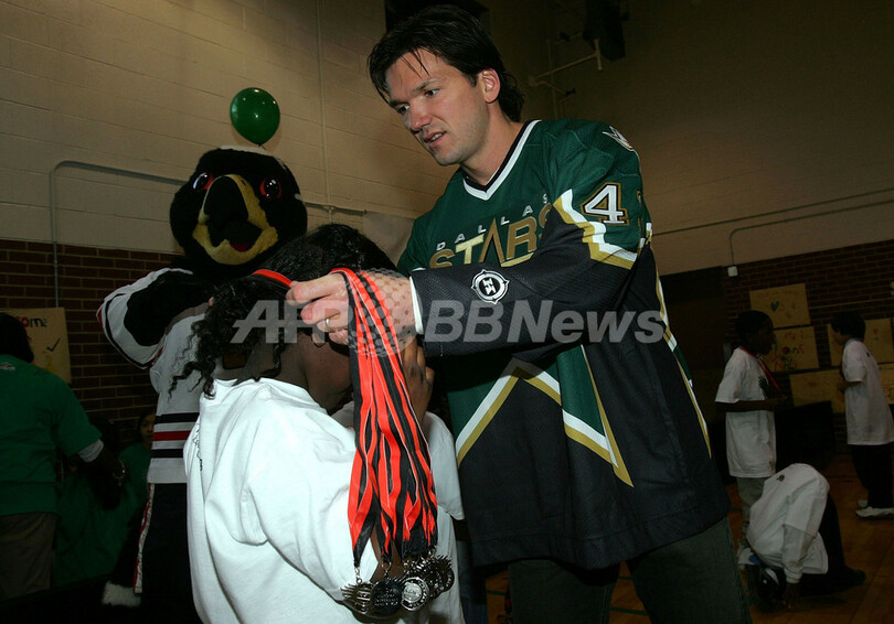 【ダラス/米国 22日 AFP】06-07NHL、24日に開催される第55回オールスター・ゲーム(55th NHL All-Star Game)を前に開催地のダラス市内にあるラニアン小学校(Runyon Elementary School)でNHLストリート・オールスター・トーナメント(NHL Street All-Star Tournament)が開催され、オールスターに選出された選手たちが参加し、子供たちとの交流を深めた。写真は、ラニアン・オールスターズのゴーリー、Alexander Cano君(左)の構えをチェックするダラス・スターズ(Dallas Stars)のマシュー・バーナビー(Matthew Barnaby、右)。(c)AFP/Getty Images Ronald Martinez