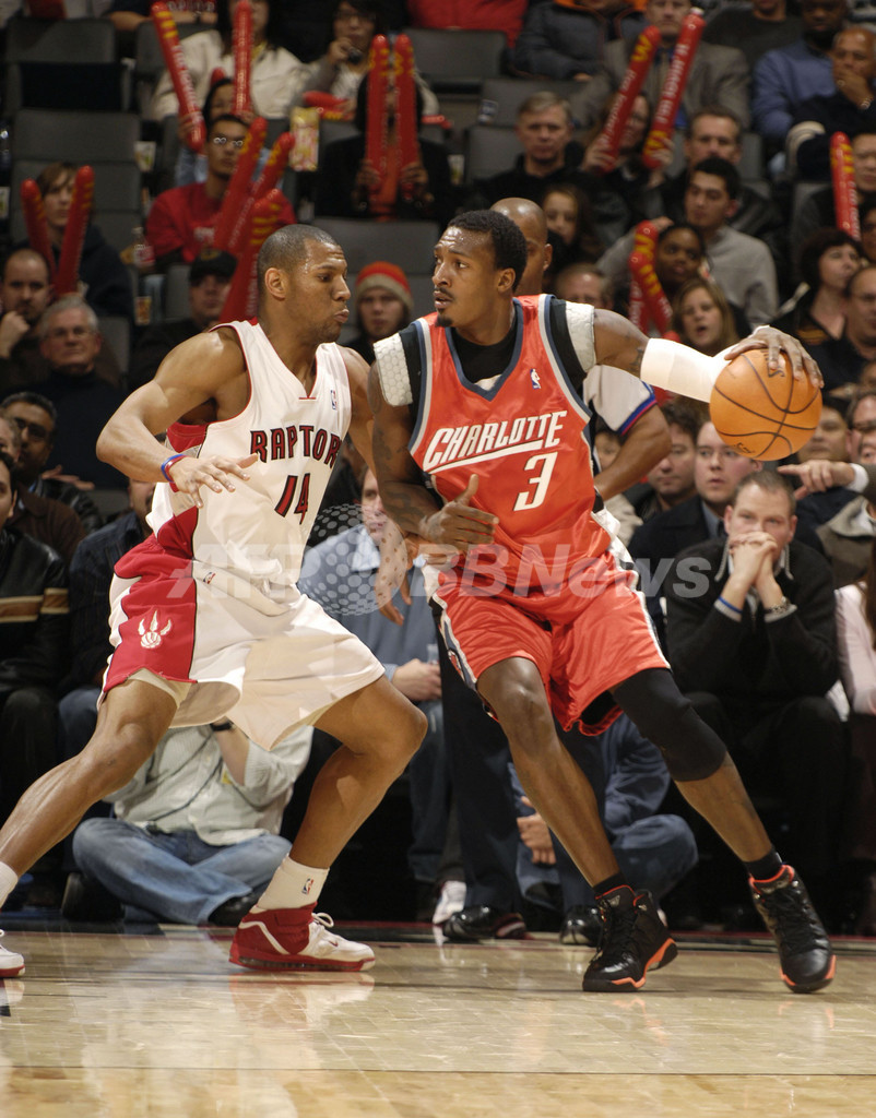 【トロント/カナダ 22日 AFP】06-07NBA、トロント・ラプターズ(Toronto Raptors)vsシャーロット・ボブキャッツ(Charlotte Bobcats)。ラプターズのホセ・マヌエル・カルデロン(Jose-Manuel Calderon)は、19得点11アシストで今季3度目のダブルダブルを記録し、チームの勝利に貢献した。試合は、第3Qのボブキャッツの攻撃をわずか8得点に抑えるなどディフェンスが上手く機能したラプターズが105-84で快勝し、今季20勝目を挙げた。写真はボブキャッツのエメカ・オカフォー(Emeka Okafor、左)のディフェンスをかわしてシュートを放つカルデロン。(c)AFP/Getty Images Ron Turenne